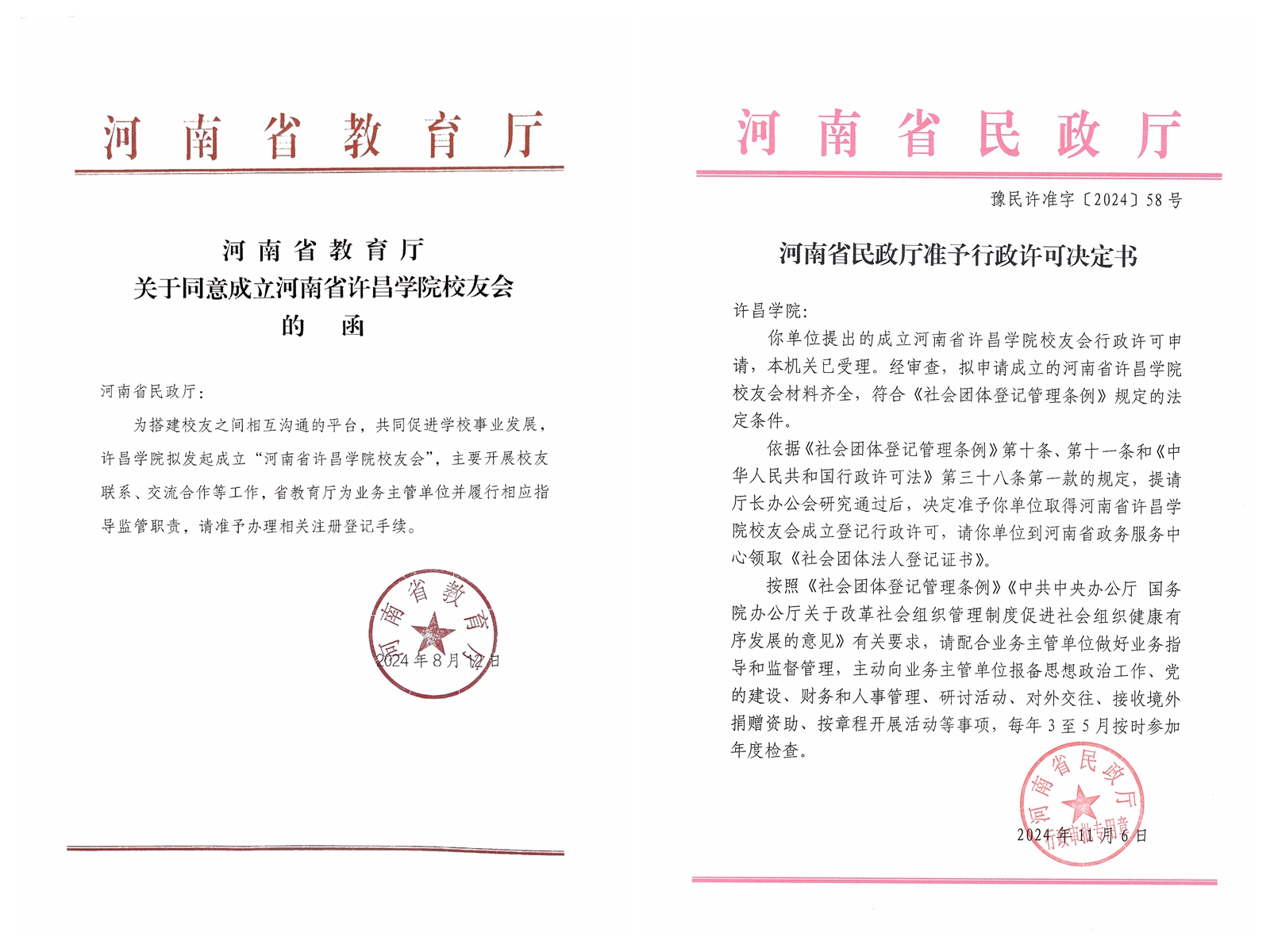 近日,在学校各项事业奋力迈进之际,在广大师生、校友的热切期盼中,河南省民政厅下发了“河南省民政厅准予行政许可决定书”【豫民许准字(2024)58号】文件,并颁发了河南省bat365官网登录入口校友会“社会团体法人登记证书”。至此,365官网校友会成为由省教育厅批准、省民政厅注册登记、具有法人资格的合法社团组织。