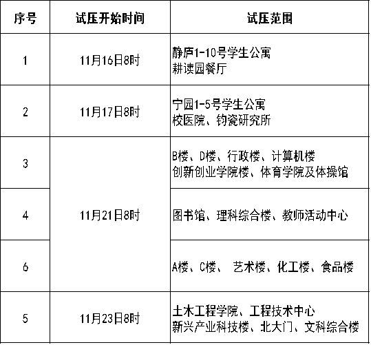 5.学生公寓楼群试压期间,各学院要通知本院学生,宿舍内务必留人观察,避免因漏水造成损失。