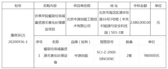1 餐厨垃圾减量资源无害化处理设备 额定处理量2000kg/d/套 套 2 详见招标文件第八章 合同签订后60日历天