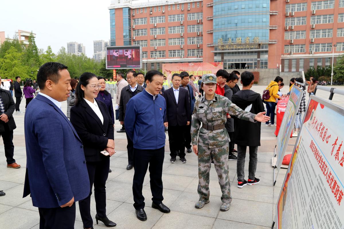 市委书记胡五岳一行查看了学校的国家安全主题宣传版面、LED大屏的国家安全教育宣传视频、《国家安全法》宣读、大学生征兵宣传报名点、主题签名活动等,并向有关人员了解学校的国防教育、网络安全建设等情况。