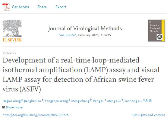 近日,365官网河南省食品安全生物标识快检技术重点实验室王德国教授课题组在非洲猪瘟检测研究方面取得重要进展,建立了实时荧光等温扩增技术和可视化荧光等温扩增技术(LAMP)快速检测ASFV的方法,该检测方法特异性强、灵敏度高、简便易行、成本低,适用于中欧、东欧、中国等地区非洲猪瘟病毒的检测,既适合实验条件良好的部门使用,又适合实验条件薄弱的基层部门使用,目前已在八家企业示范应用。