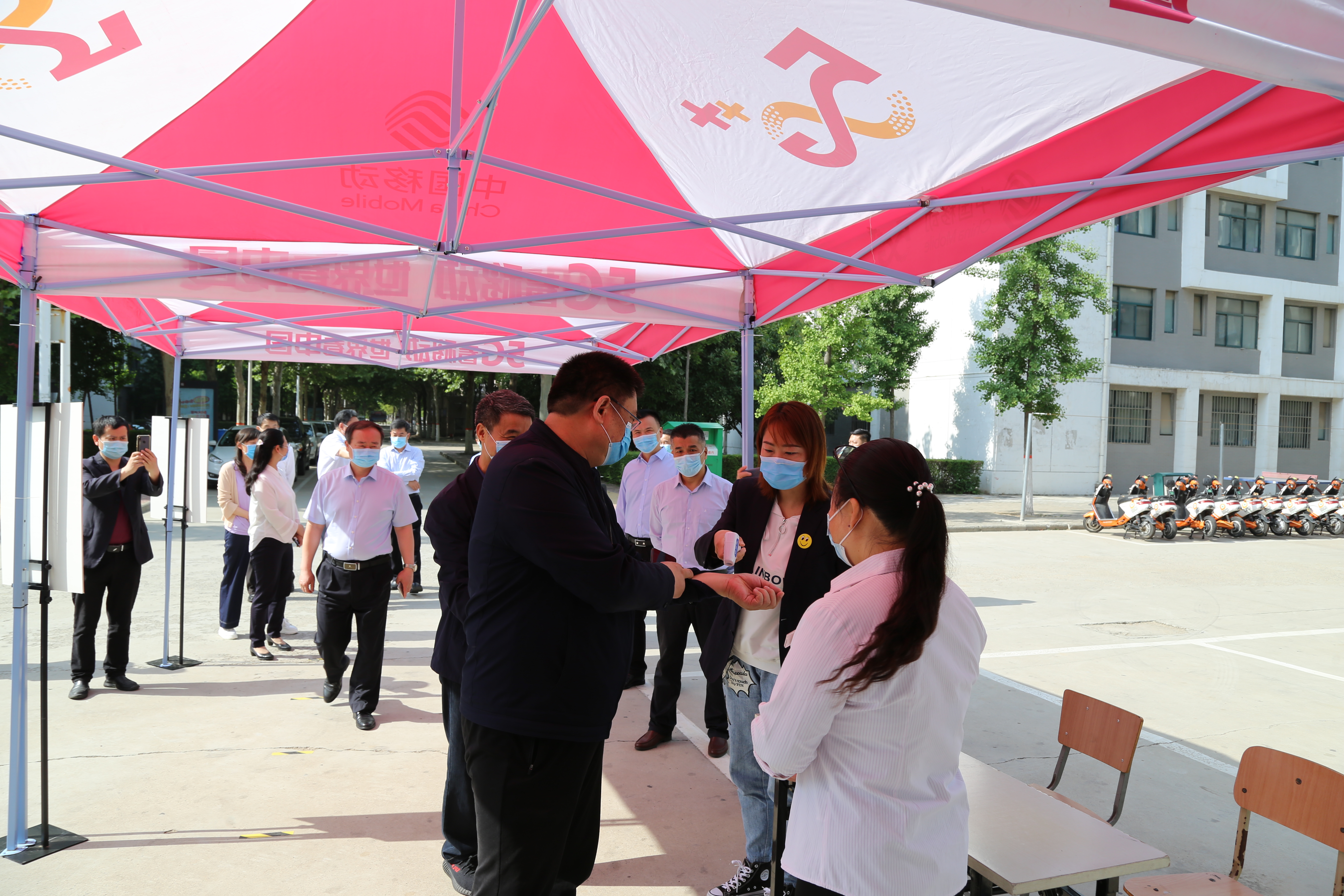 党员先锋岗的教职工们边引导同学们办理返校手续,边向家长、学生介绍学校的防疫准备工作,让大家吃下“定心丸”。