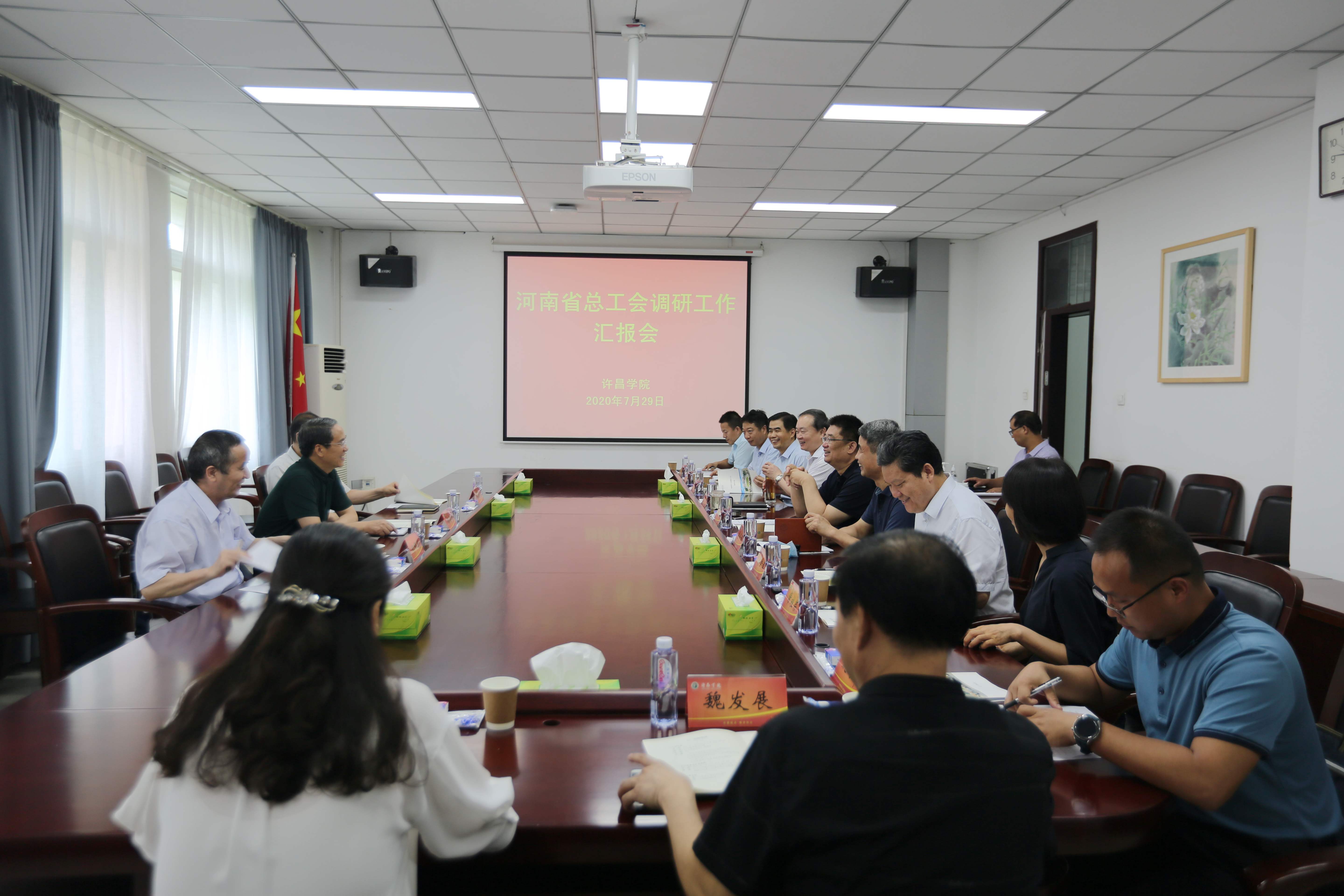 7月29日,河南省总工会党组成员、副主席杨会卿,二级巡视员乔建民,省教科文卫体工会二级调研员郑锦顺一行到365官网调研指导工作。学校在办公楼第四会议室召开调研汇报会,党委书记闫纪建,院长岳修峰,党委副书记、工会主席郭涛,副院长高金星出席会议,院长岳修峰主持会议。