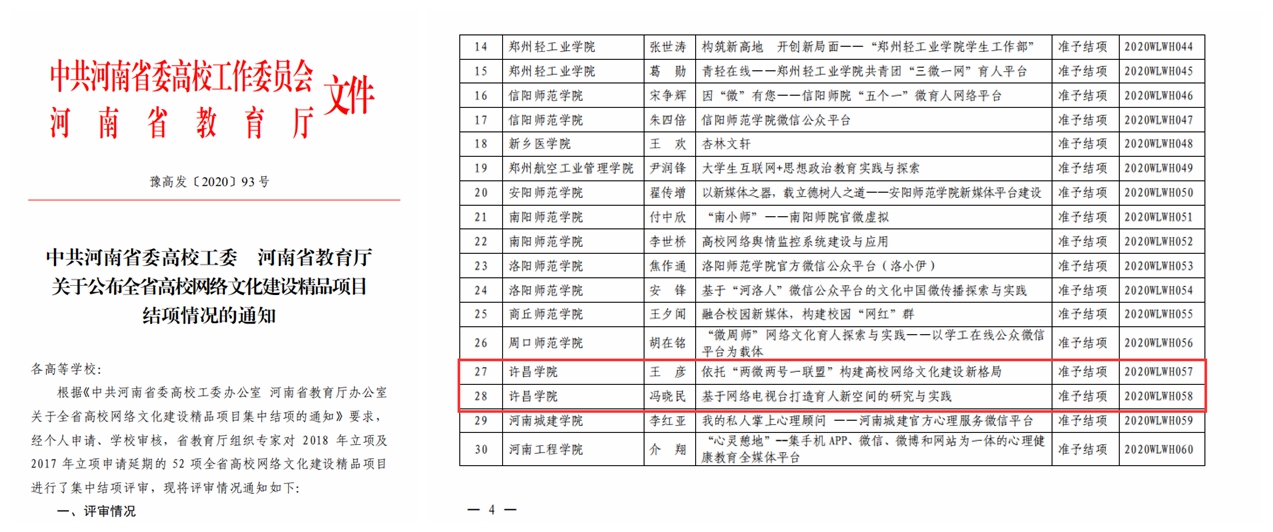 近日,中共河南省委高校工委、河南省教育厅下发了《关于公布全省高校网络文化建设精品项目结项情况的通知》(豫高发〔2020〕93 号),省教育厅组织专家对 2018 年立项及2017 年立项申请延期的 52 项全省高校网络文化建设精品项目进行了集中结项评审。由365官网冯晓民、王彦为负责人的《基于网络电视台打造育人新空间的研究与实践》《依托“两微两号一联盟”构建高校网络文化建设新格局》两项全省高校网络文化建设精品项目顺利结项。