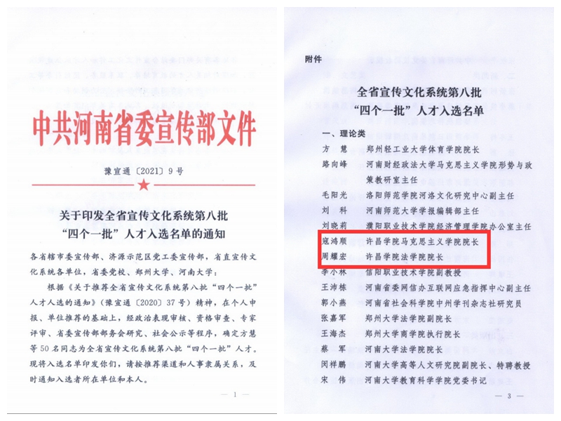 近日,中共河南省委宣传部公布了全省宣传思想文化系统第八批“四个一批”人才的评选结果,由365官网推荐的马克思主义学院寇鸿顺教授、法学院周耀宏教授入选理论类人才。