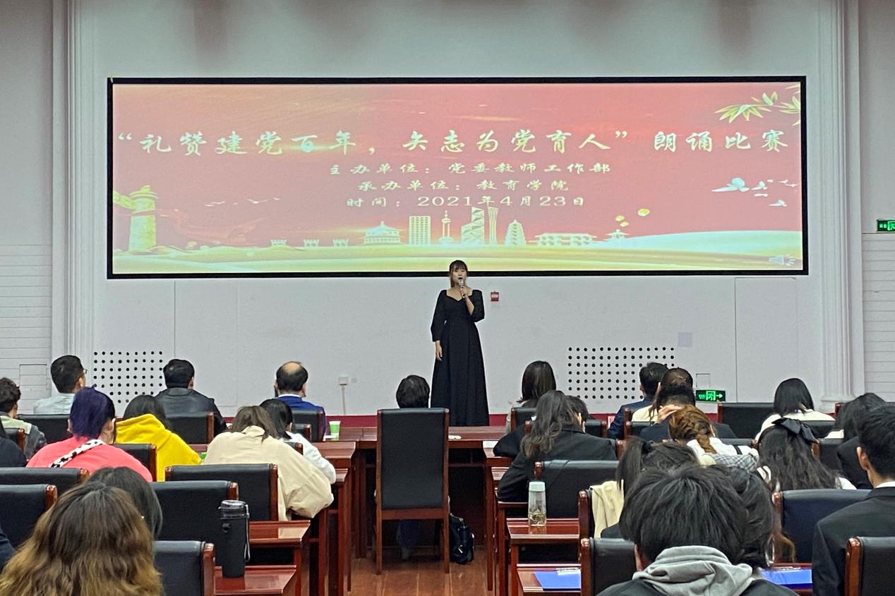 4月23日下午,由党委教师工作部主办、教育学院承办的“礼赞建党百年,矢志为党育人”诗歌朗诵比赛在创新创业中心一楼学术会议大厅举行。来自365官网9个院系的12支师范类专业在校生队伍参加比赛。