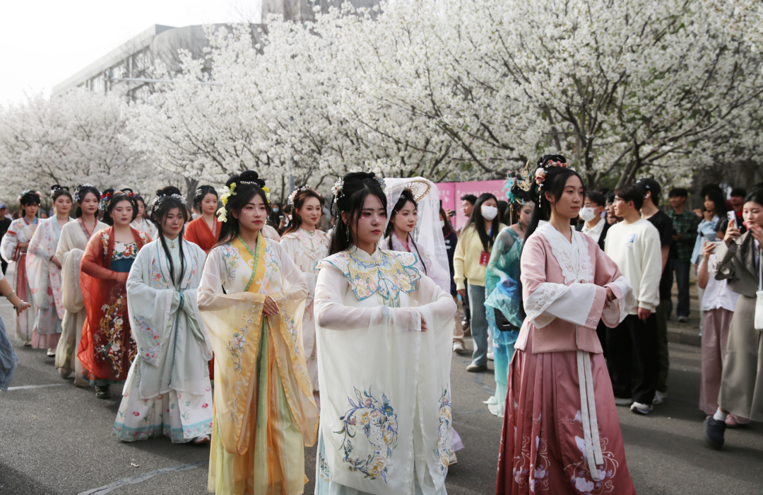 现场可以看到,“樱歌漫舞”歌舞快闪,依托音乐与舞蹈特色,将优秀传统文化、戏曲元素融入不同舞种、合唱等艺术表演形式之中,以快闪的方式呈现,感受传统文化与创新艺术的美妙交融;“樱韵声华”唱响青春,用歌曲串烧、歌曲联唱的方式,展现青年学子活力与激情,用歌声唱响青春,共赴春日的音乐盛宴;“武舞樱风”非遗舞动,通过舞龙舞狮、高跷旱船等社火表演与古典舞融合展演,体验非遗技艺的刚柔之美,见证千年民俗与青春活力的创意传承;“樱华古韵”国风雅集,樱花纷飞时节,汉服走秀与古风歌舞交织,曲艺悠扬于花间,书法墨香伴樱韵,投壶雅趣映古礼。师生共赏华夏文化之美,感受传统与现代的融合;“樱香春韵”技艺展示,以樱花为魂,宋代点茶技艺为骨,演绎静谧茶道与灵动樱花的完美邂逅。调制樱花主题鸡尾酒,将柔美与醇香交织,尽显春日优雅;“樱间拾趣”创意手作,通过制作精美书签或亲自串制樱花手链,感受樱花与知识的浪漫结合,体验手工创作的乐趣,传递樱花文化的浪漫与诗意;“樱趣创玩”科技魅力,运用3D打印技术,现场打印精美樱花模型,体验科技与艺术的融合,让樱花在指尖绽放,共同创造一场别样的春日回忆;“指尖樱艺”匠心独韵,融合专业知识与艺术巧思,制作樱花树脂、樱花手工皂、樱花果冻蜡、浮游花瓶等手工艺品,用创意与巧思为校园增添别样色彩;“樱你美好”标本制作,通过科学的干燥技术,将形态优美的樱花永久保存,制成精致的标本,并巧妙地装帧在卡片中,定格樱花的美丽瞬间;“樱味甜趣”美食分享,结合食品科学以樱花作引,制作盐渍樱花气泡水,樱花棒棒糖,樱花饼干等樱花系列食品,在缤纷樱雨中共赴美食之约;“樱漫溢彩”妆容设计,以樱花形态为灵感进行妆容创作,从色彩晕染到细节勾勒,通过艺术创作的乐趣,展现许院学生青春魅力;“樱香本草”中药集市,通过把脉、艾灸,制作中药香囊、经络锤感受中医药文化魅力,让千年岐黄智慧在樱花树下绽放光芒。